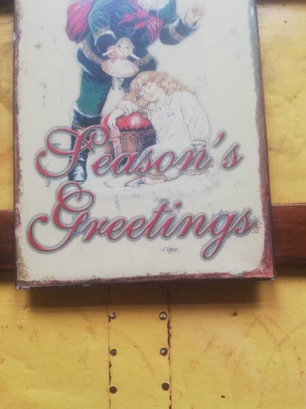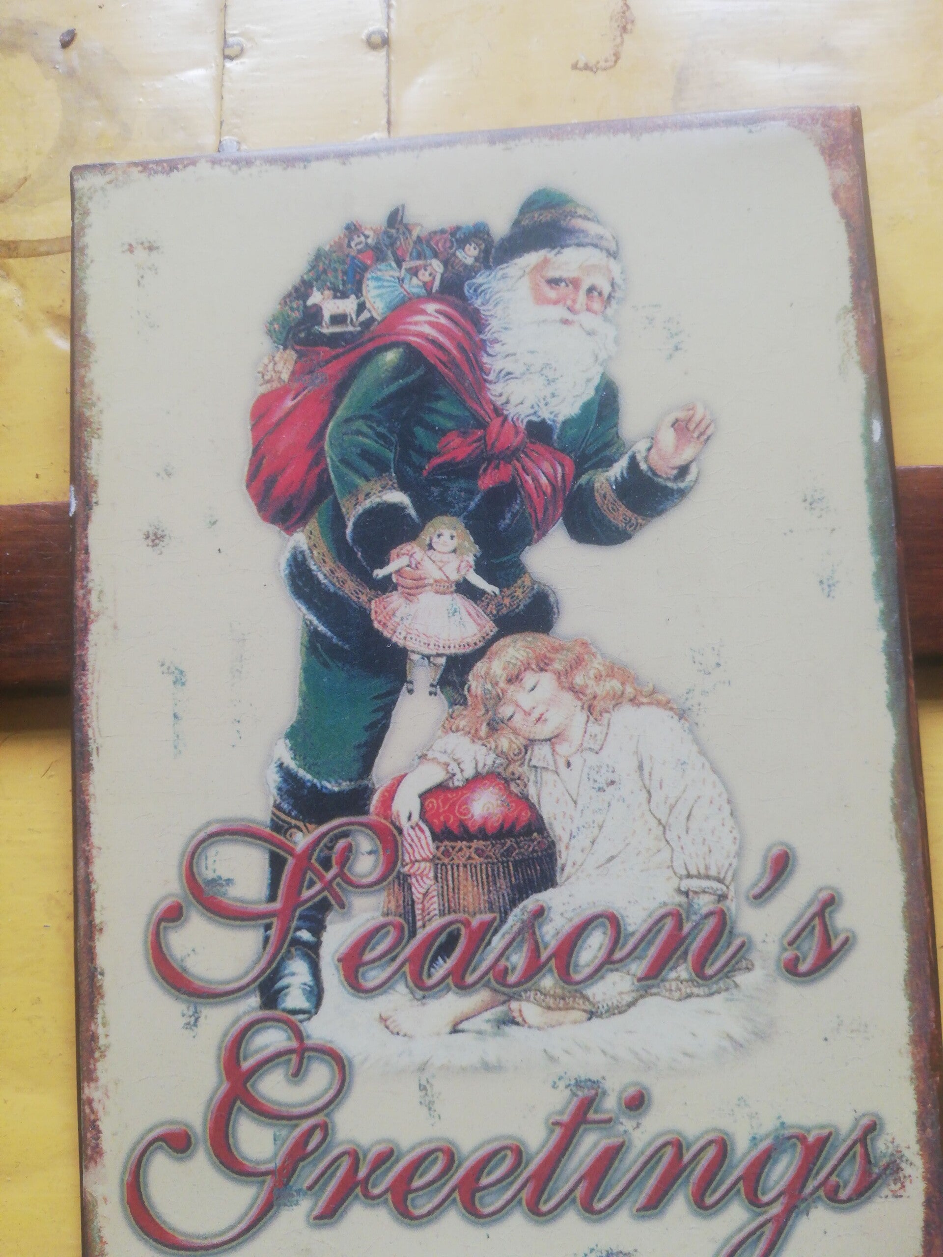 Een oude afbleeding van de Kerstman met een kindtje aan zijn voeten.