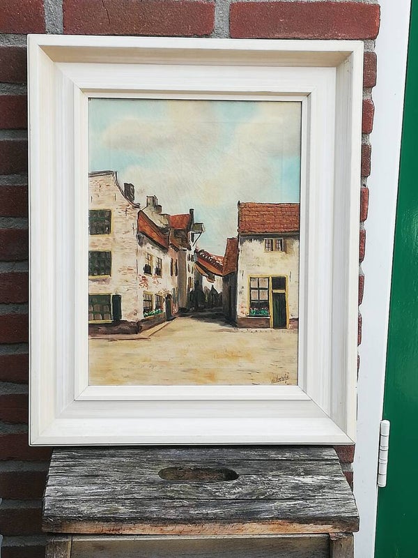 Schilderij het Straatje.De voorstelling is: Een oud straatje uit Belgie:De Schilder is :Willvillife ?Maten; 44 cm breedte , 55 cm Hoogte , Lijst breedte 8 cm.Kleur: Meer kleurig.Lijst: Wit.Geschildert : 1900.Verf; Olie verf.2023-002-Schilderij