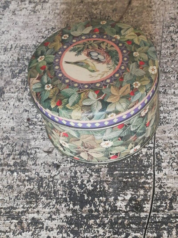 Blikje met een vogeltje vinkje.Kleuren: Veelkleurig.Voorstelling: Vogel met nestje.Soort; Snoep doosje.Maten: 6 cm hoogte , doorsneden 9 cm.Motief: Aardbeien motief.Staat: heel goedBestelnr : 2023-001-Do
