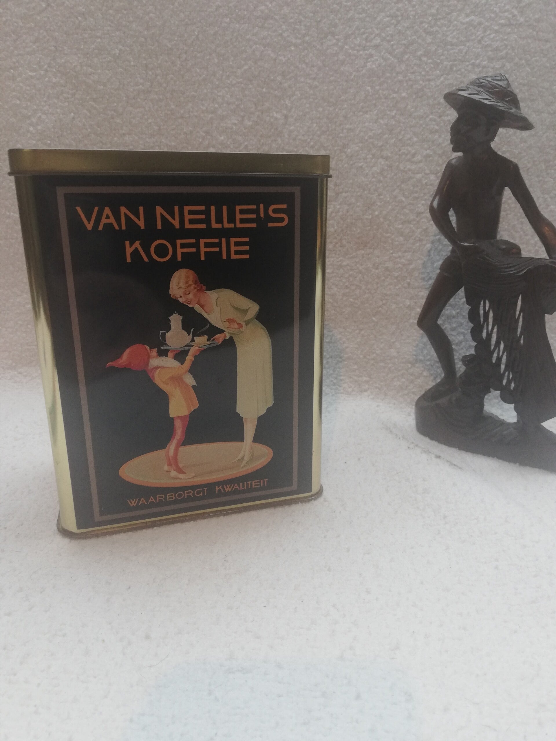 Mooi blik van Van Nelle's.Maten 15,5 x 7 x 12 cm.Veel kleurig .Voorstelling is Dame met Kabouter en dienblad met Koffie.Artiekelnr 2023-0138