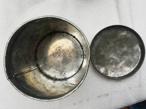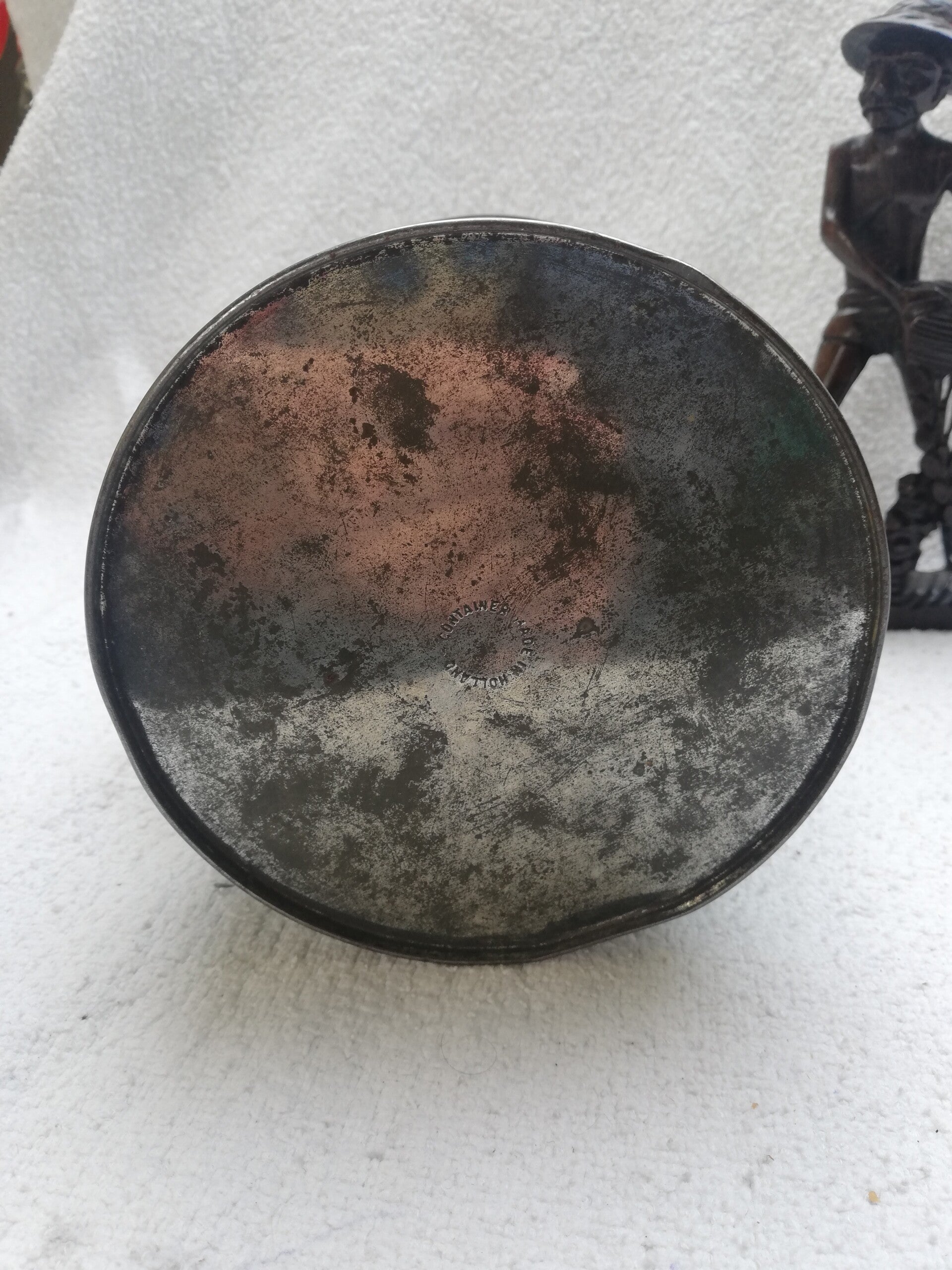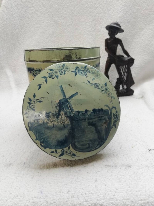Blik Hollands Landschap.Maten 14,5 diep, 13,5 doorsnede.Gemaakt in Holland.Kleur oud Beige/Blauw.Artiekelnr 2023-0160