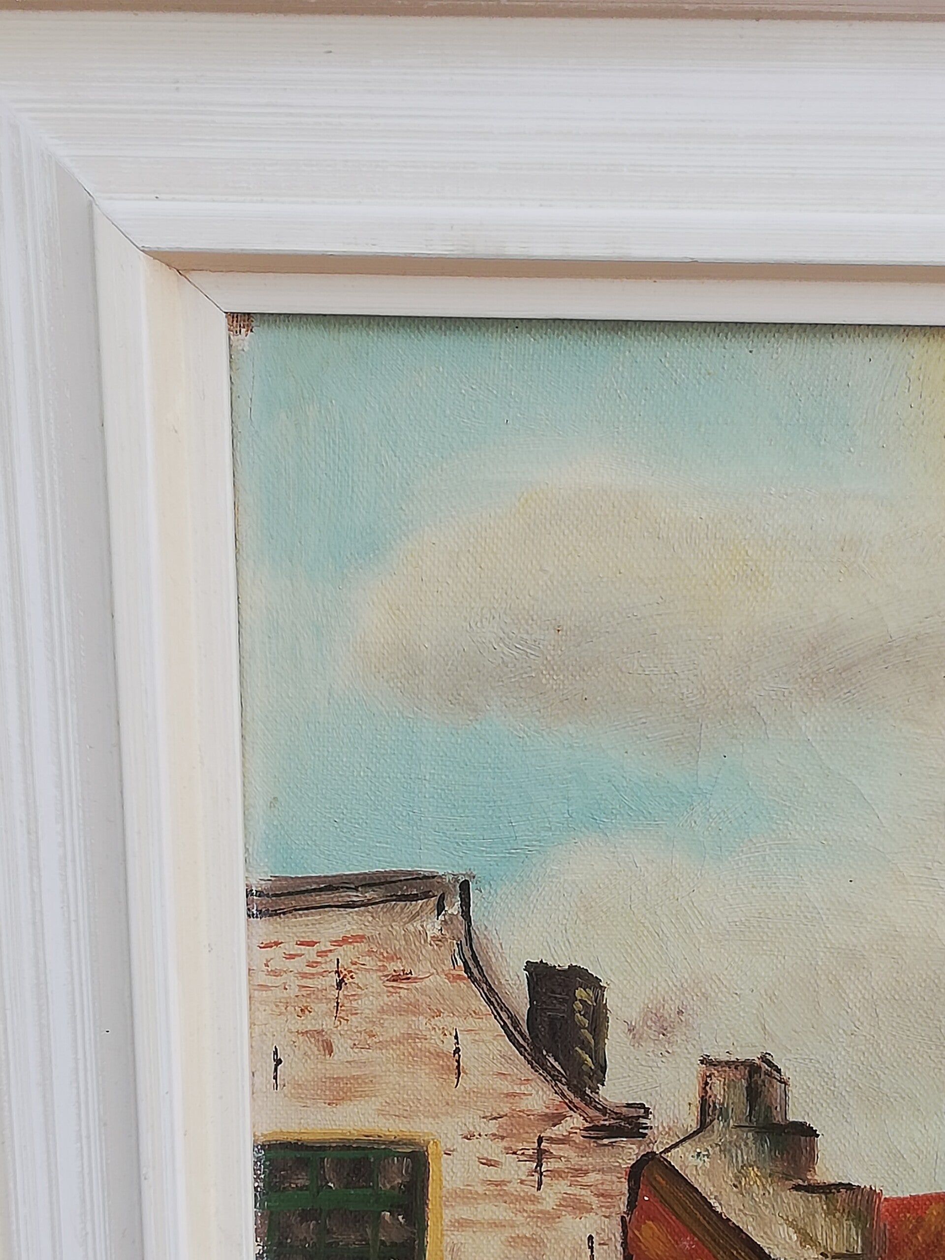 Schilderij het Straatje.De voorstelling is: Een oud straatje uit Belgie:De Schilder is :Willvillife ?Maten; 44 cm breedte , 55 cm Hoogte , Lijst breedte 8 cm.Kleur: Meer kleurig.Lijst: Wit.Geschildert : 1900.Verf; Olie verf.2023-002-Schilderij