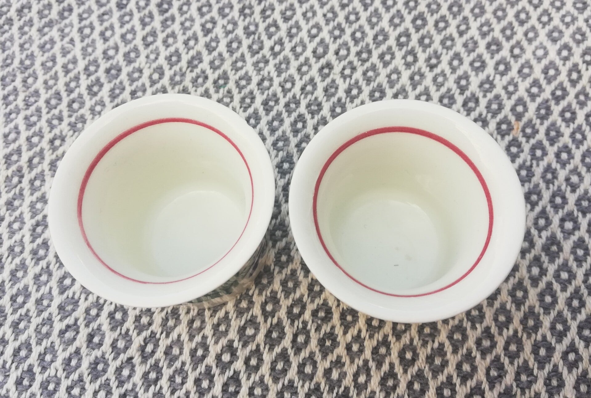Eierdopjes 2 soorten recht en met voetje.Maten; 5.5 cm H 4 cm Doorsnede.Gemaakt in Belguim.Door Boch.4 Met voet.2 Recht.