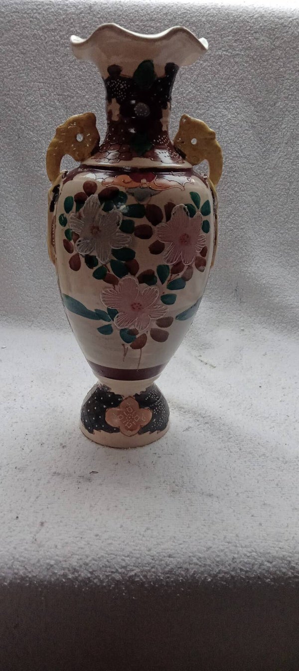 Oosterse Satsuma . Heeft geen beschadigen. Handvatten hebben een vorm van een draak. Aan de onderkant staat 3 maal 1 en teken Soort A. Is een mooi versierde vaas. Maten 33cm hoog 10 cm doorsnede klek 9 cm Doorsnede voet.