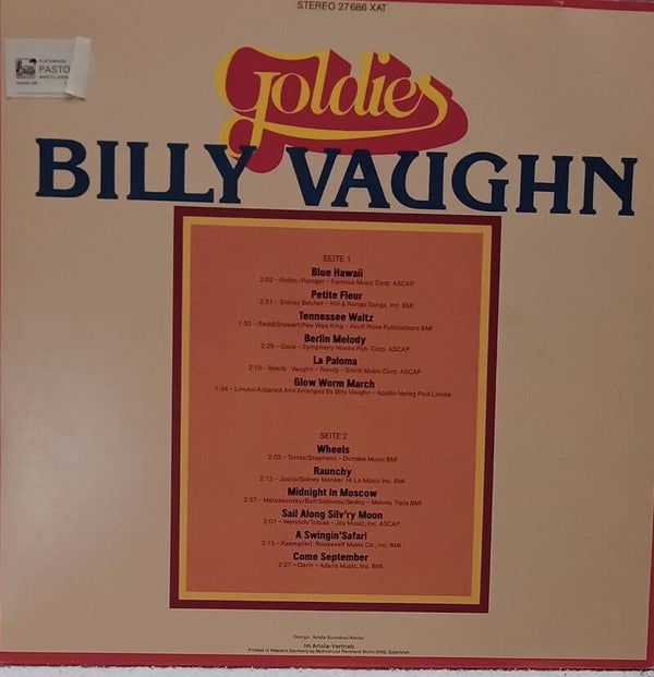Artiest: Billy Vaughn .Album: Goldies.Nummers:Bule Hawaii. Petite Fleur,Tennessee Waltz, La Paloma, Wheels.Prijs: 12,50 Euro