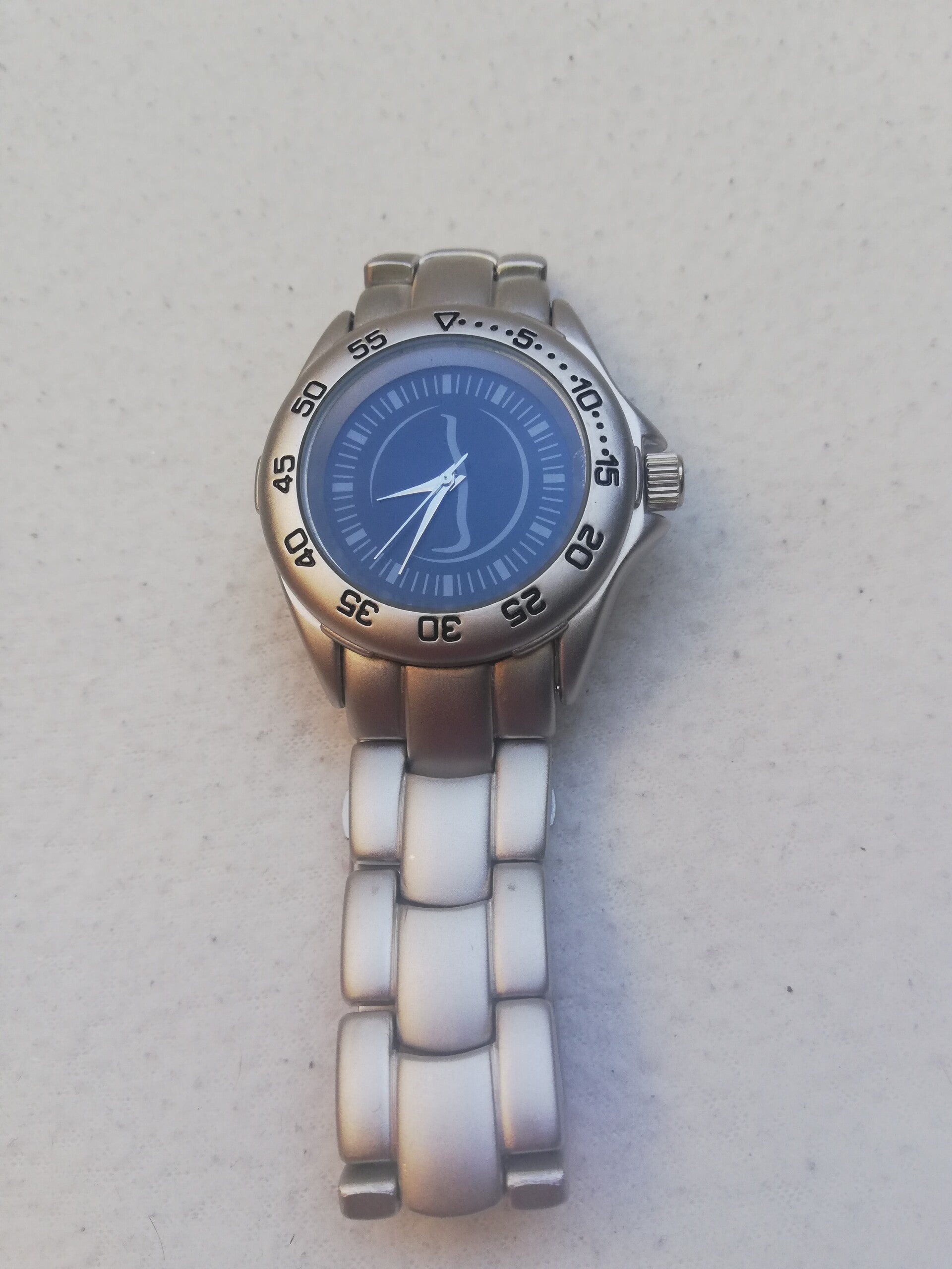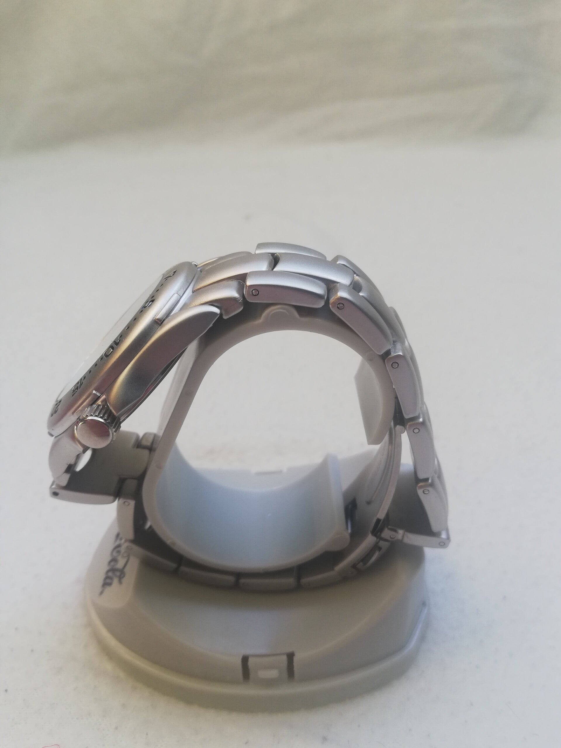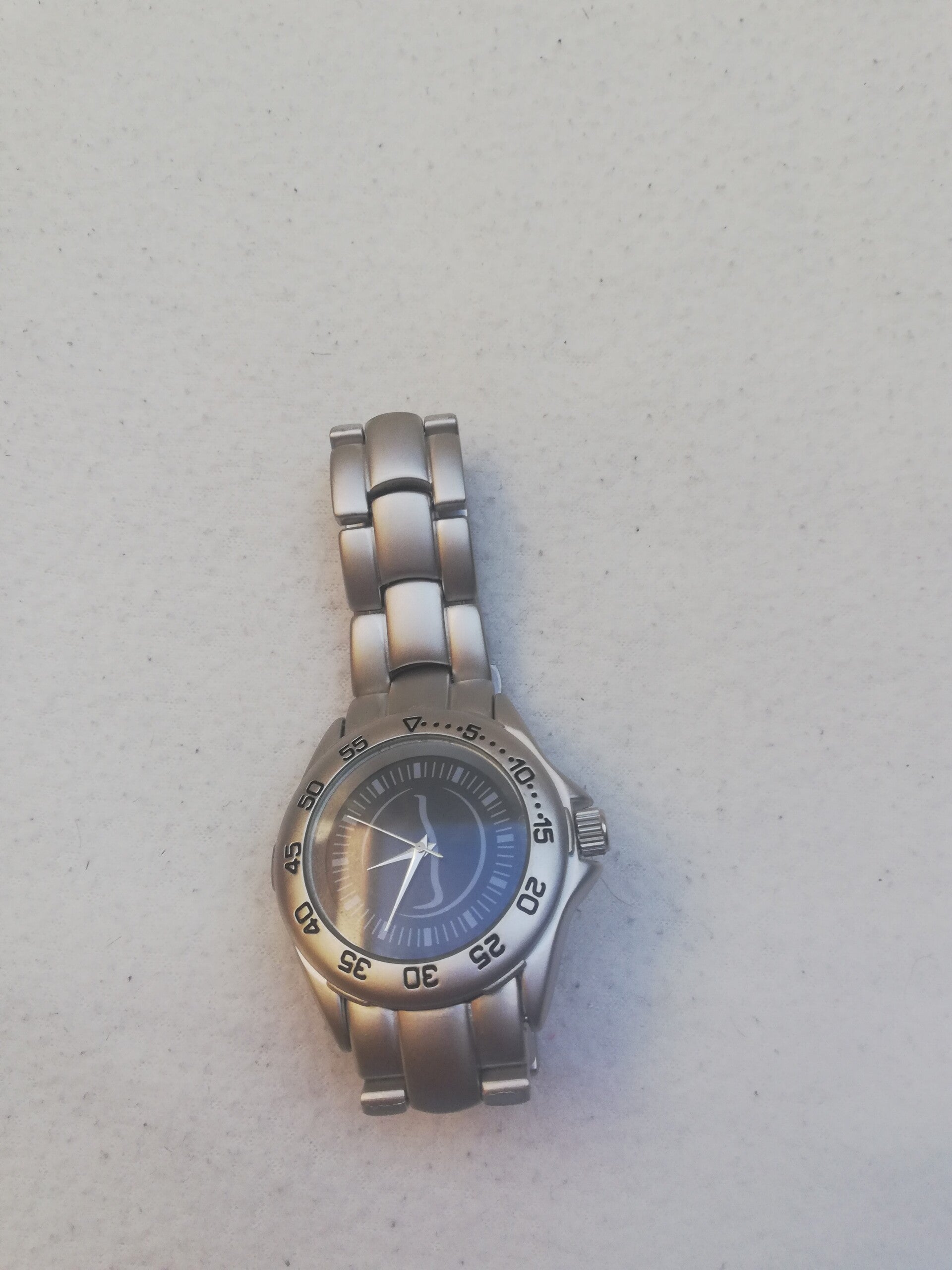 Horloge Staal met stalen band.Dit horloge heeft een duikring.De uitvoering is van mat staal.Omtrek band is 25o mm.Band open gaat via 2 pallen.Is nog niet gedragen.En voor zien van een nieuwe batterij.