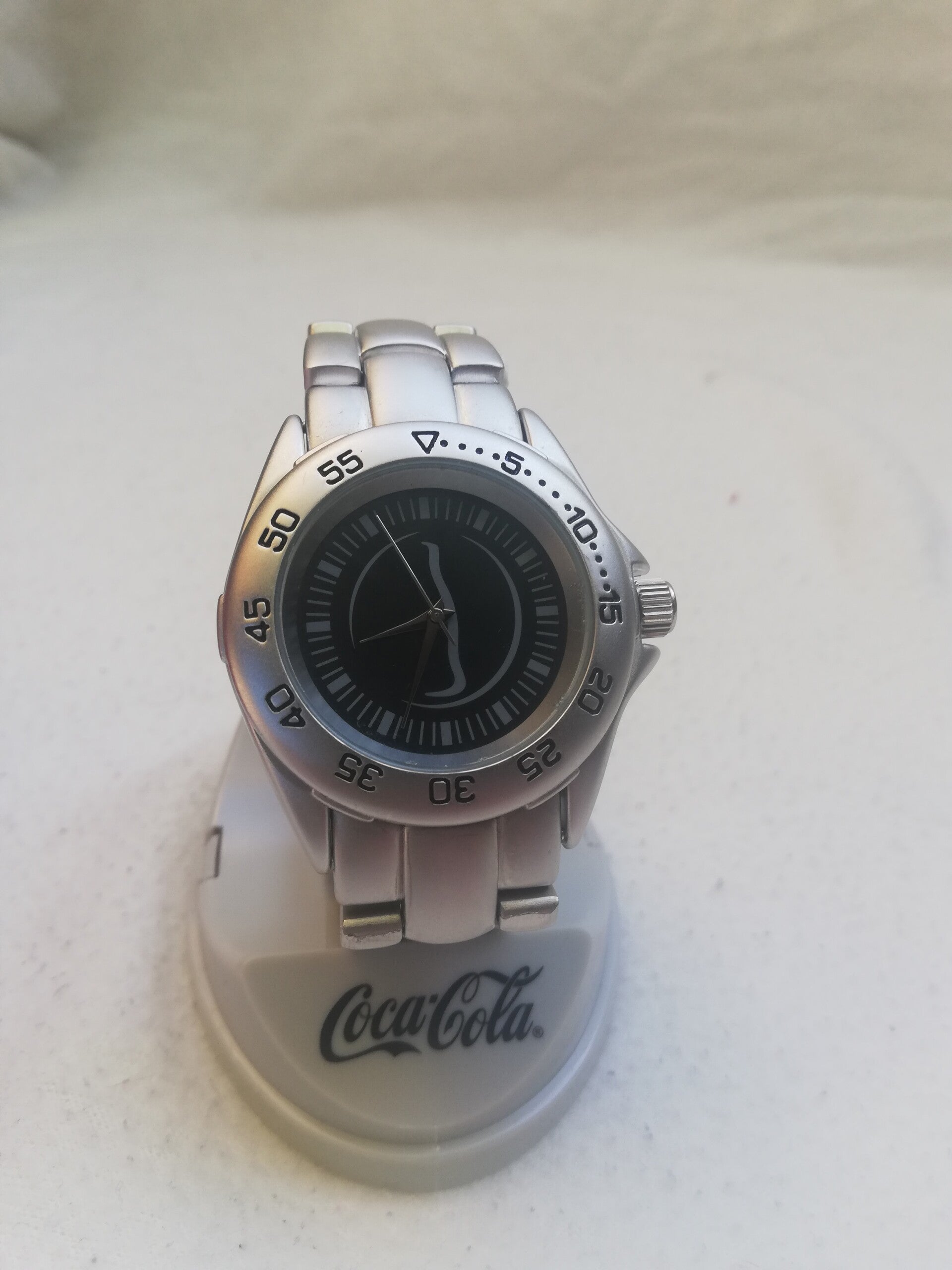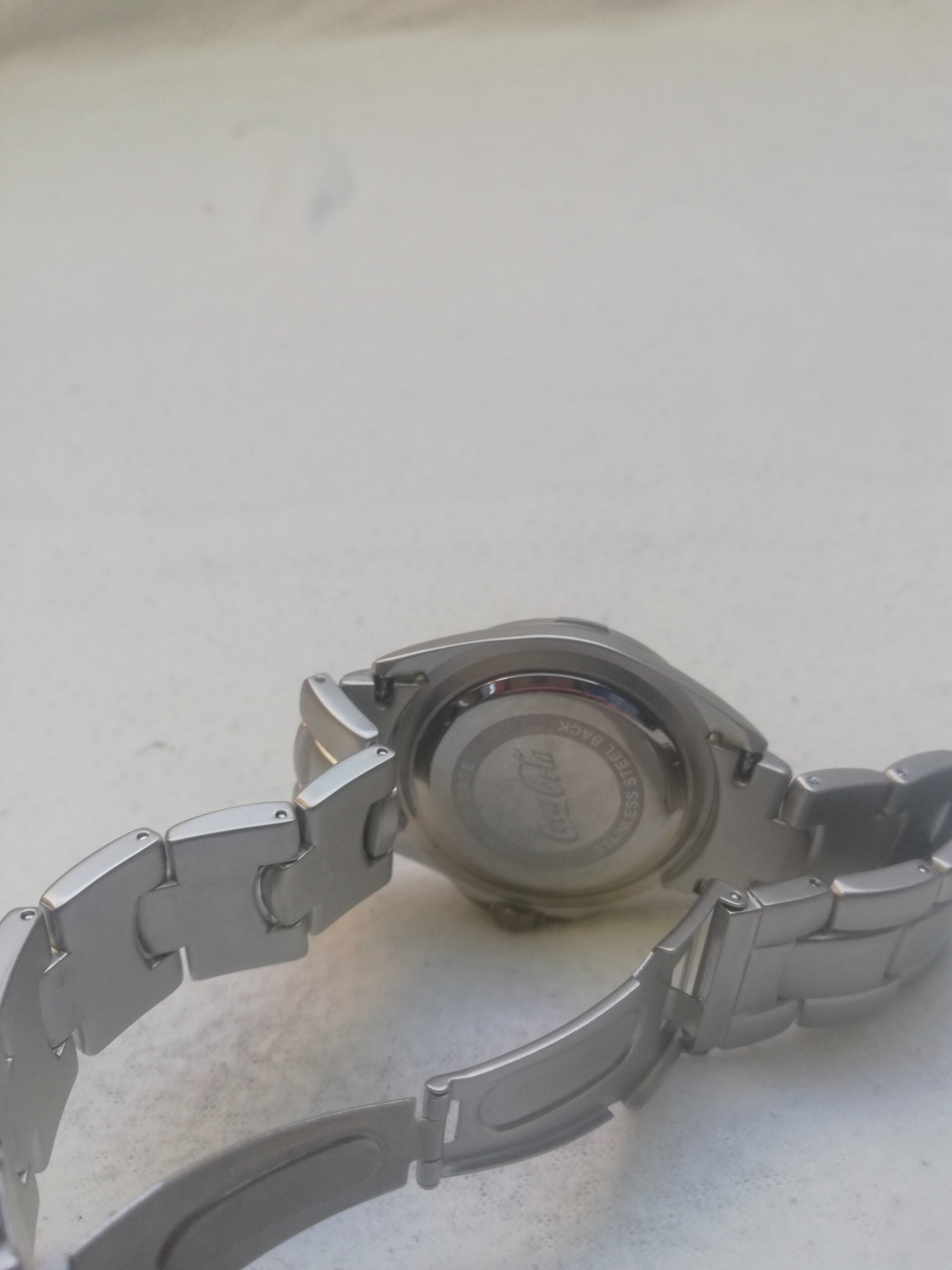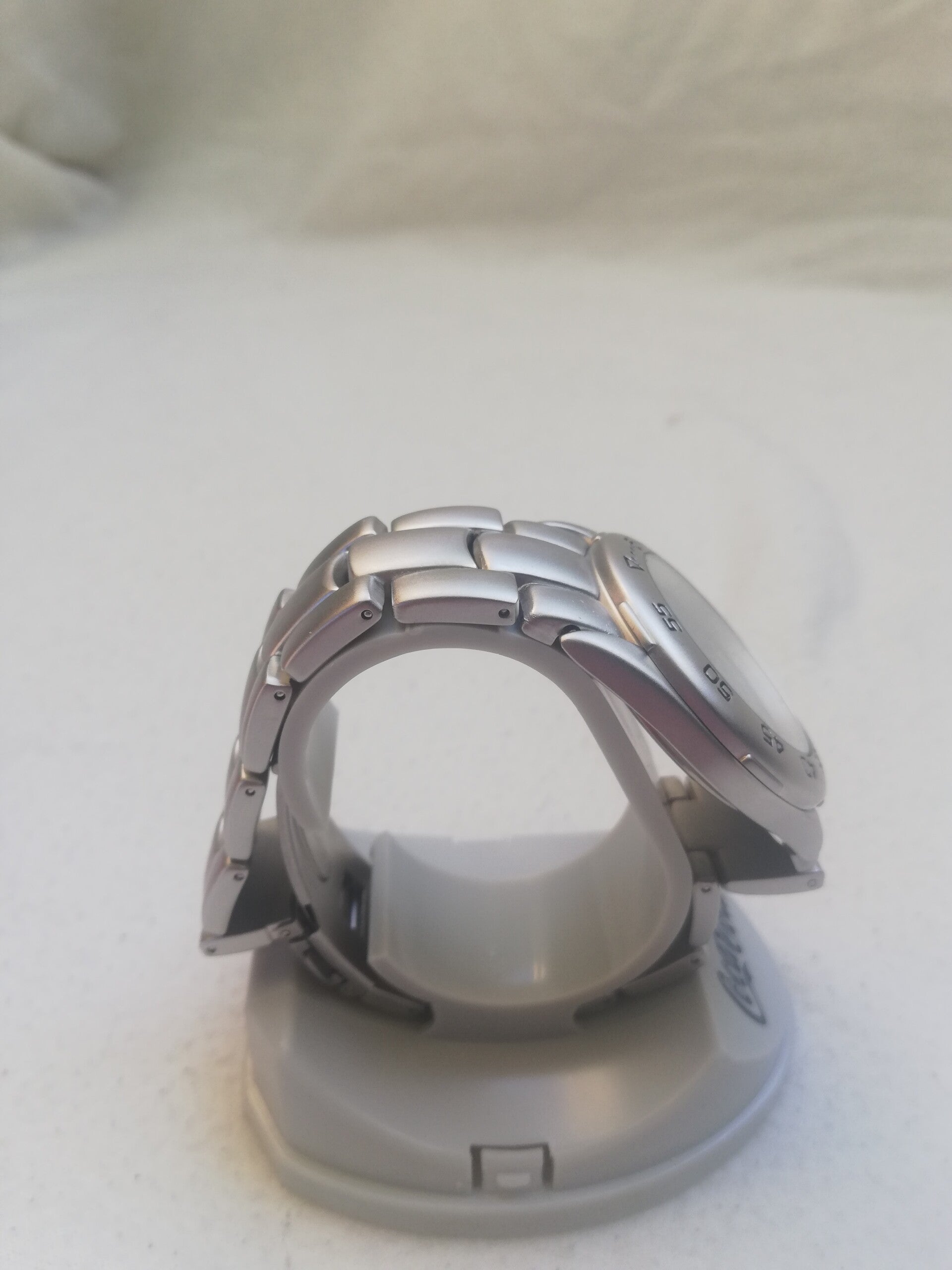 Horloge Staal met stalen band.Dit horloge heeft een duikring.De uitvoering is van mat staal.Omtrek band is 25o mm.Band open gaat via 2 pallen.Is nog niet gedragen.En voor zien van een nieuwe batterij.