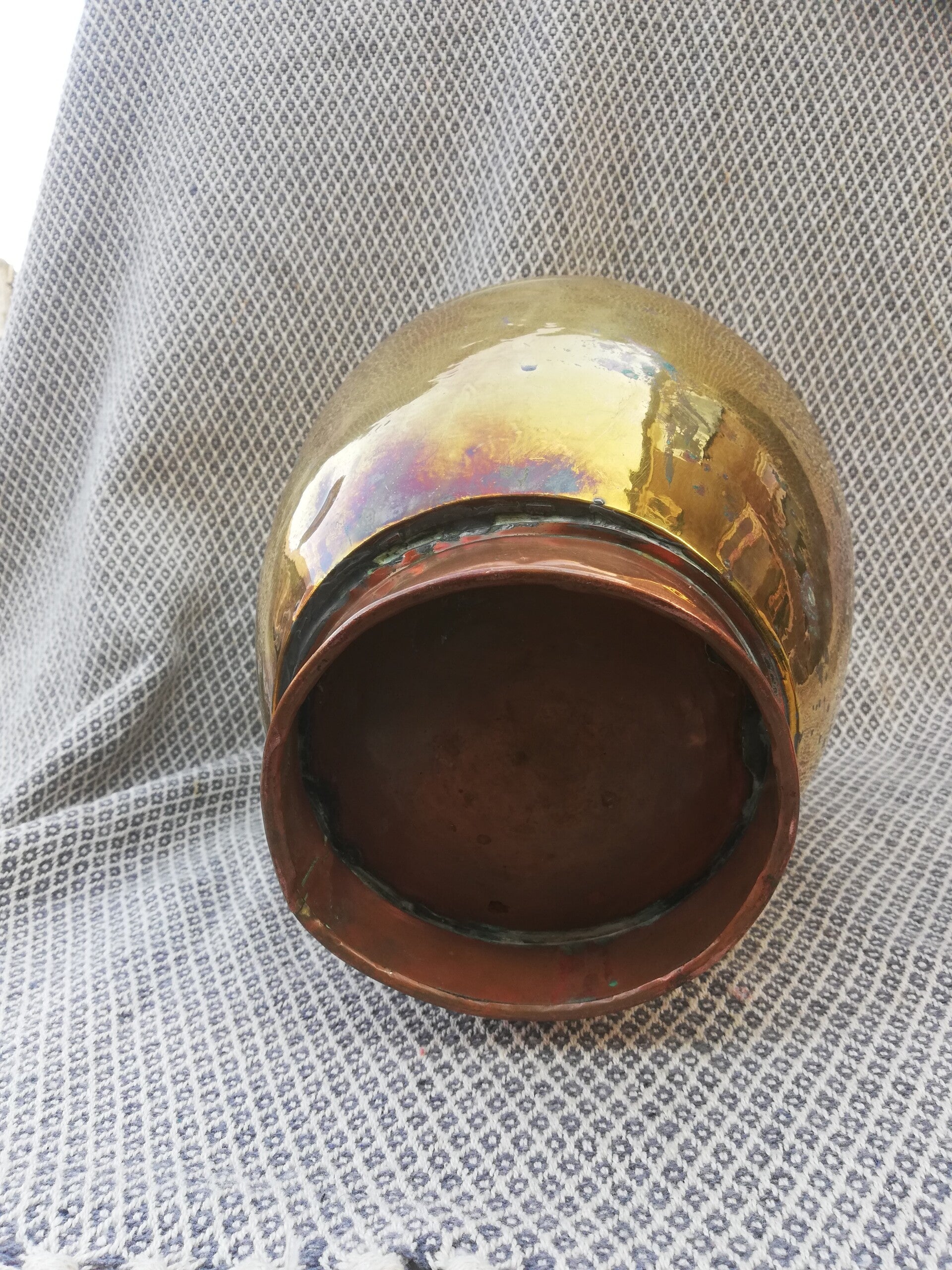 Vaas heeft een deksel van geel koper en een voet van rood koper.