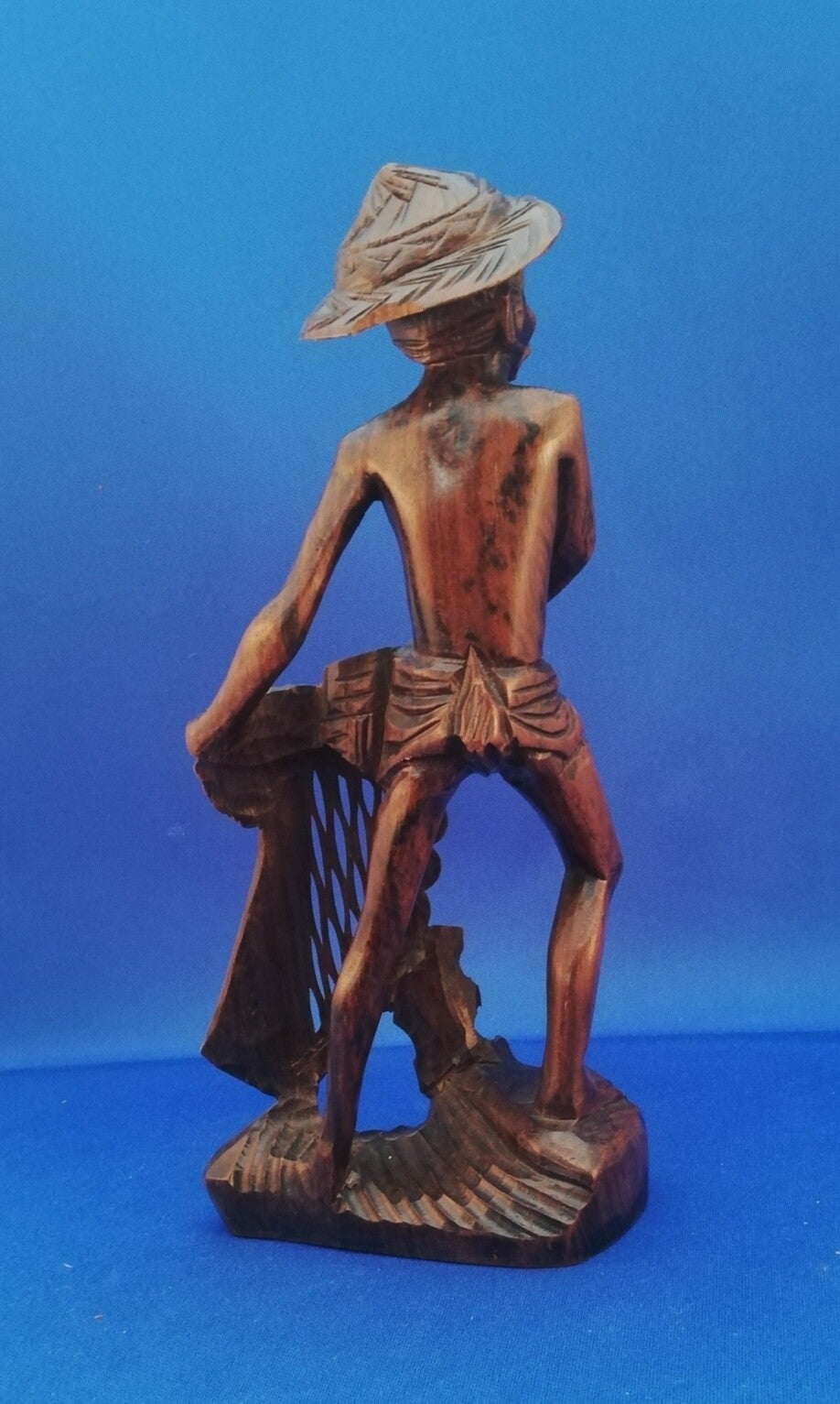 Een Balinese Visser.Een prachtig stuk hout snijwerk.Deze visser is nog van zware kwaliteit.Beeld is 19cm hoog en 9 cm breed.Is donker hout gesneden.Artikelnr 21-12-003