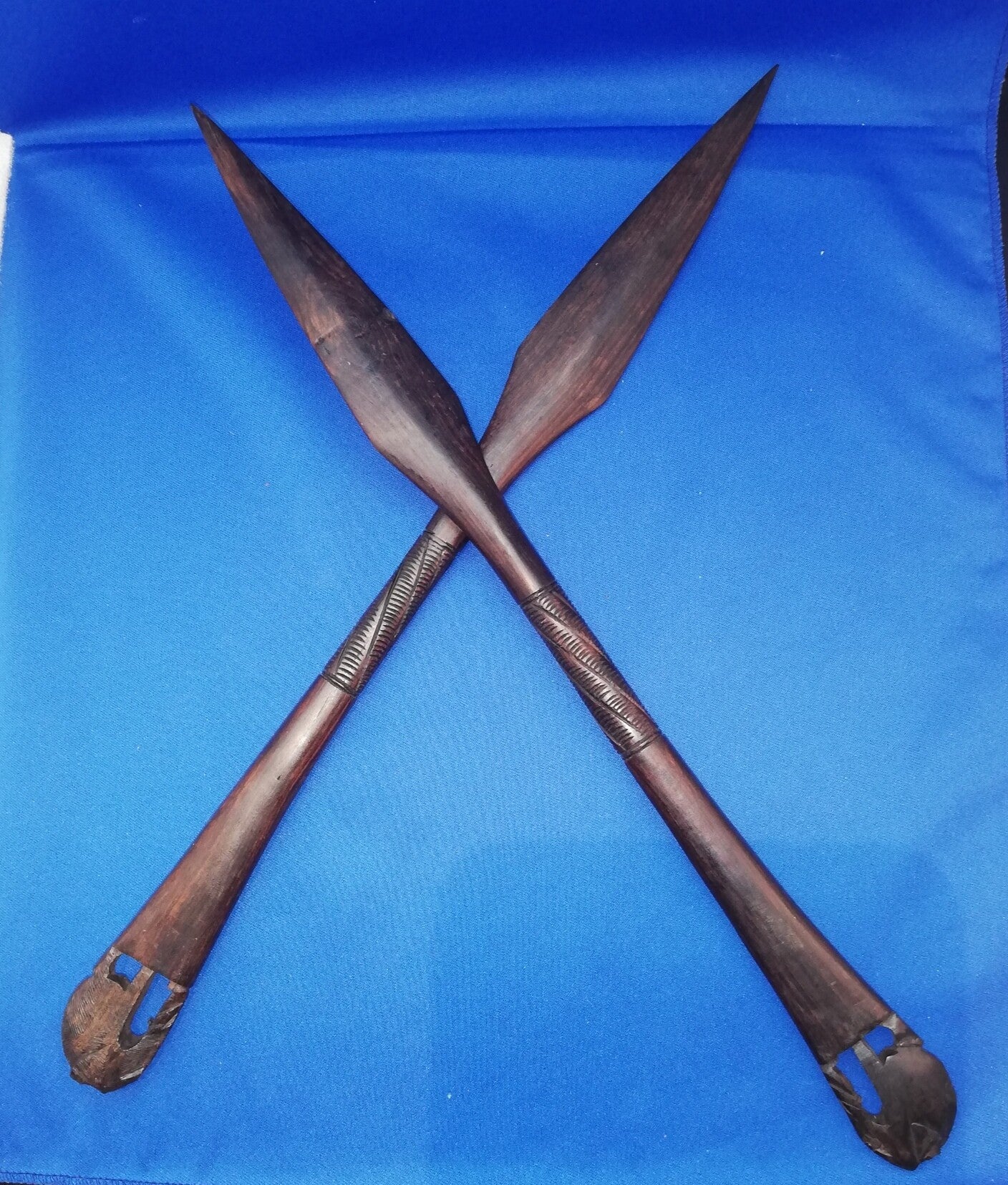 Indonesische Speren voor aan de muur.Speren zijn versierd mijn een Olifantje p je handgreep.De lengte van de speren zijn 43 cm.Artikelnr 21-12-011