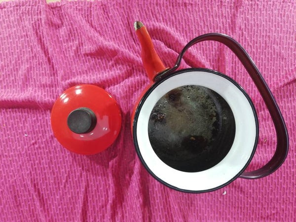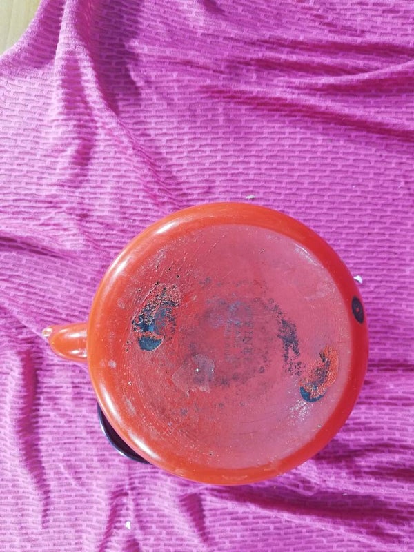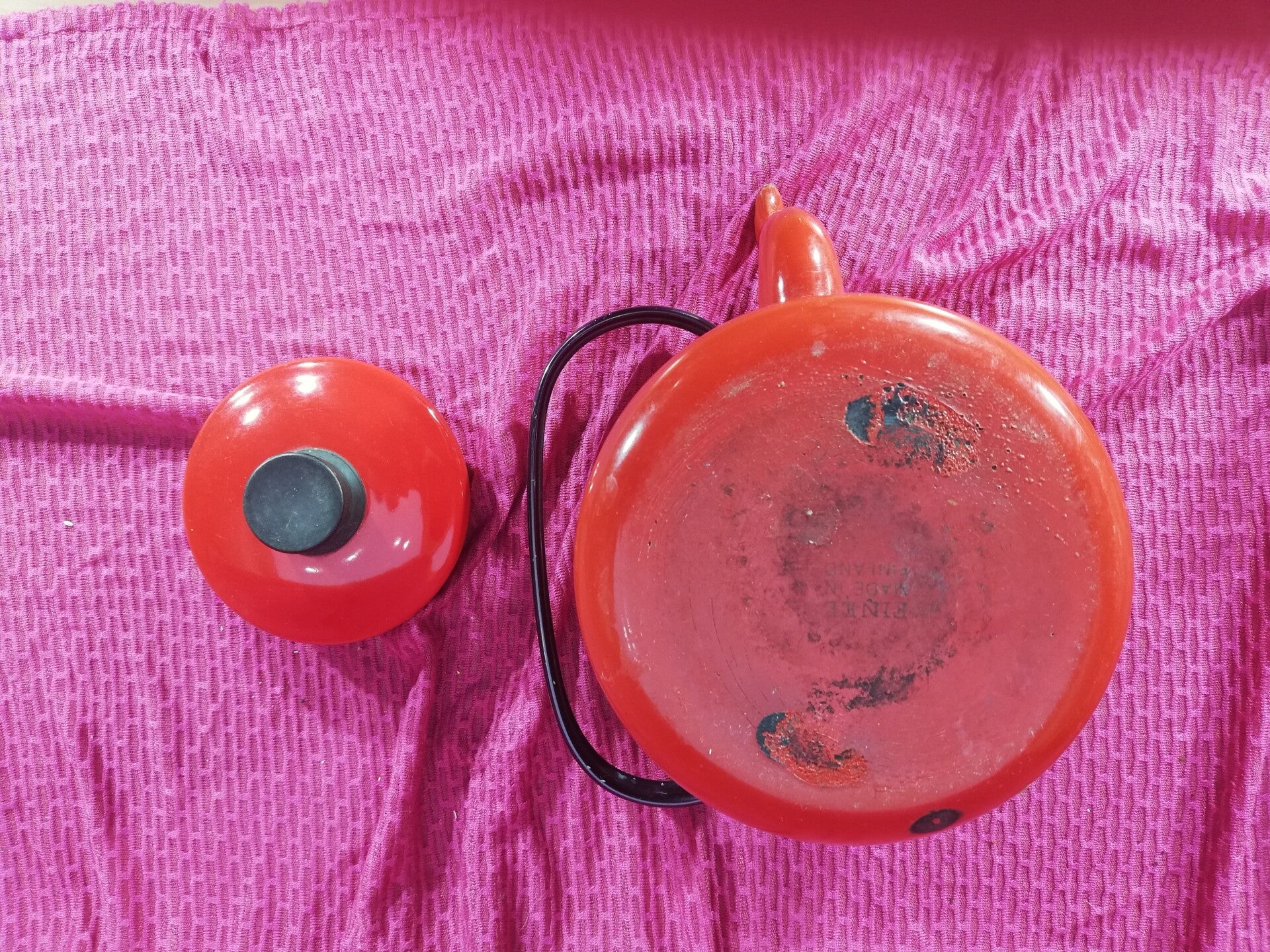 Aan de onderzijde van ketel staat het merk. Er zetten wel enkele kale plekken op. Is gemaakt in Finland