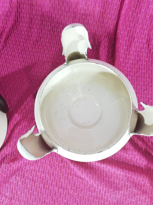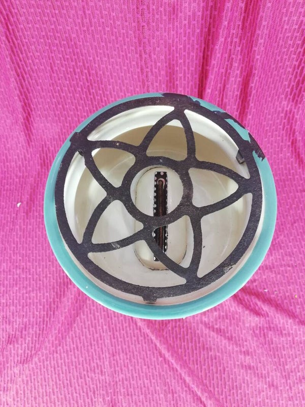 Aan de bovenzijde zit een mintgroen rand die iets beschadigt is.